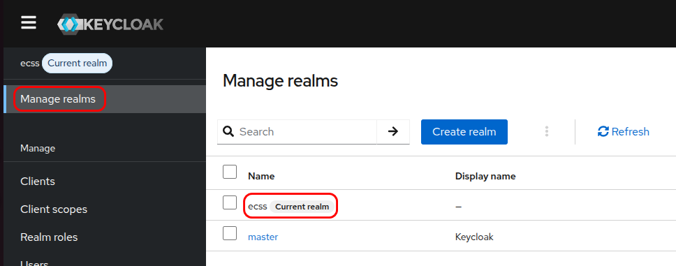 В разделе Manage realms убеждаемся, что ваш realm отмечен как «Current realm»:
