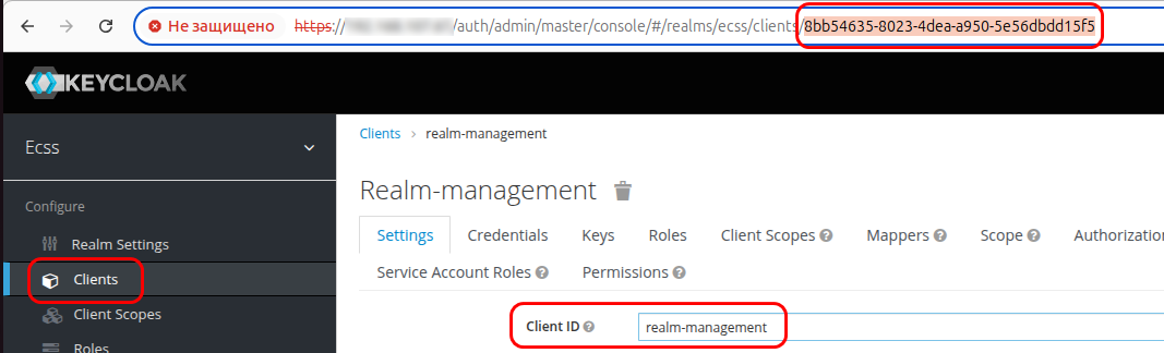 Переходим в раздел Clients, среди списка клиентов (поле Client ID) находим «realm-management». В адресной строке браузера отобразится искомый ID (см. рис. ниже):