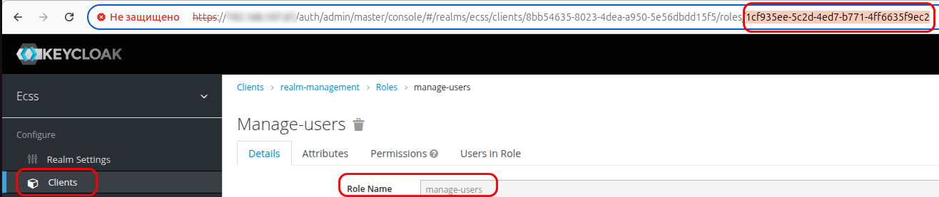 Для того чтобы найти значение для поля KEYCLOAK_MANAGE_USERS_MANAGEMENT_CLIENT_ROLE_ID, вновь переходим в Clients → realm-management → Roles. Cреди списка ролей (поле Role name) находим «manage-users». В адресной строке браузера отобразится искомый ID (см. рис. ниже):
