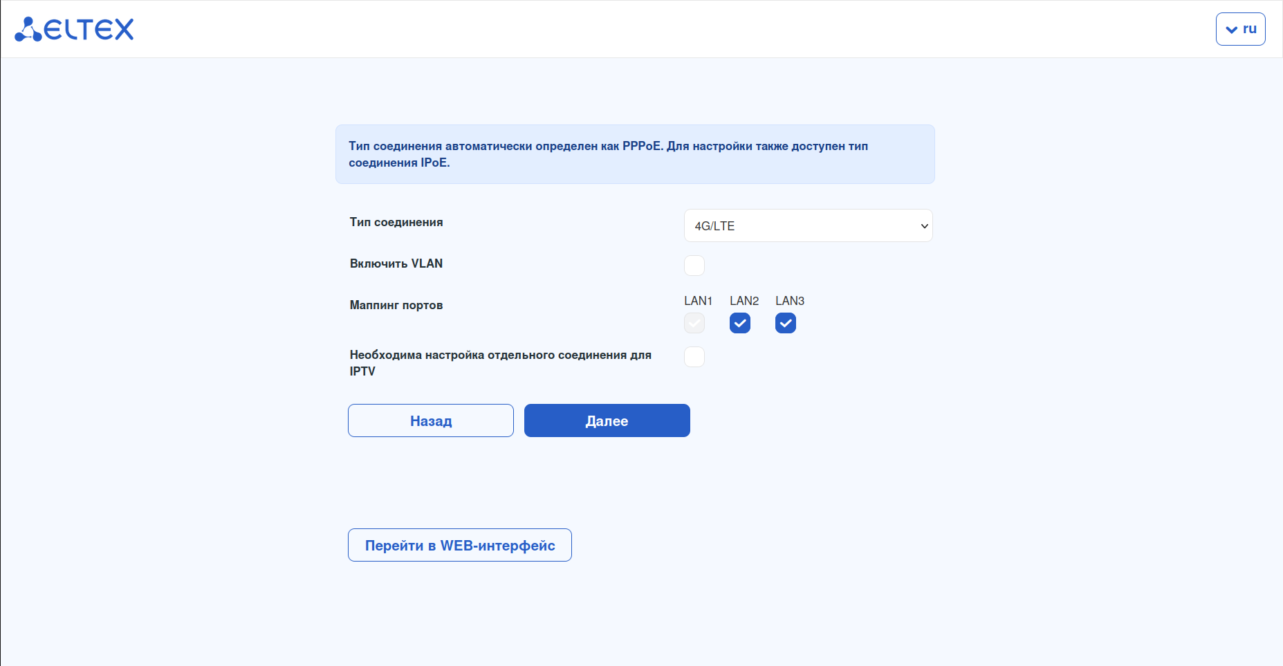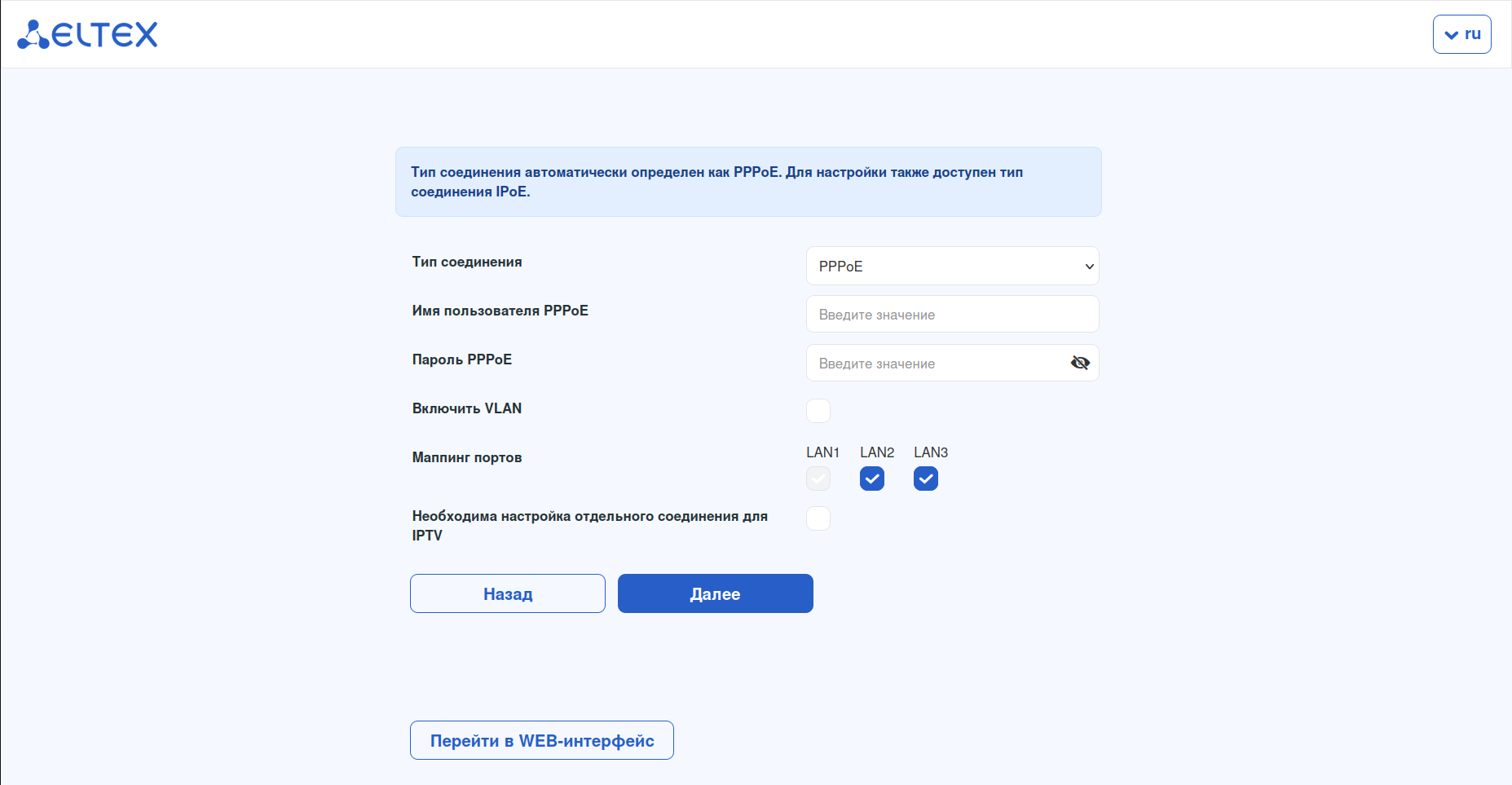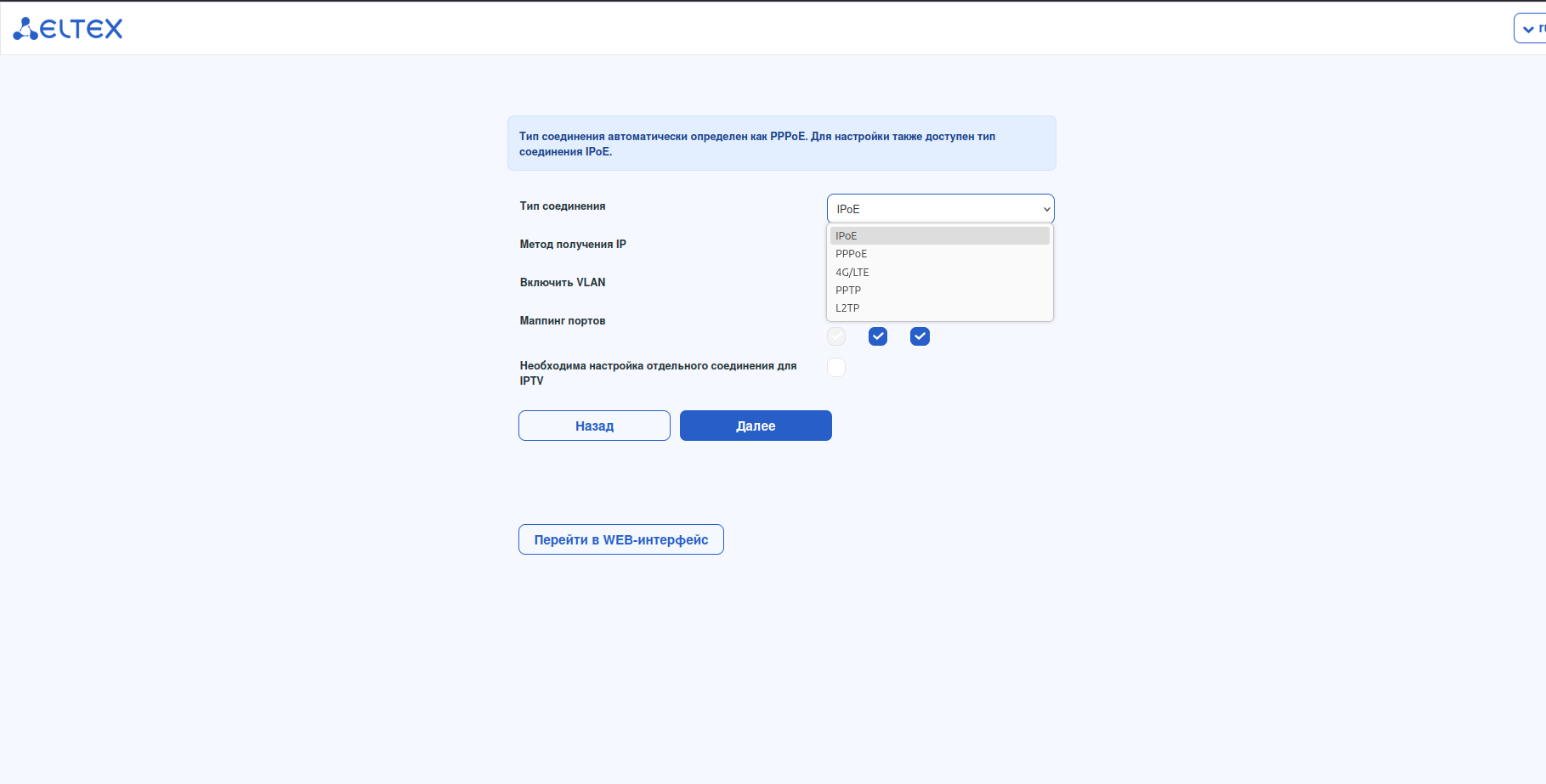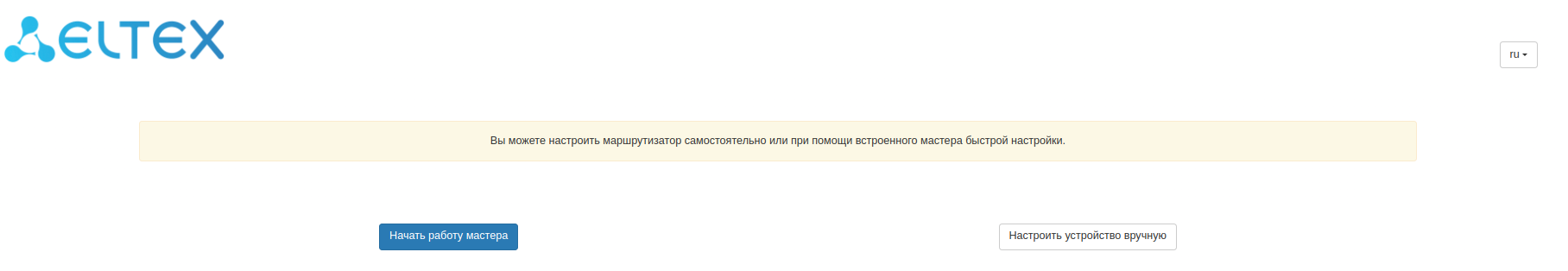 При первом включении маршрутизатора Eltex и подключении сетевого кабеля в WAN-порт требуется указать тип подключения, используемый провайдером.