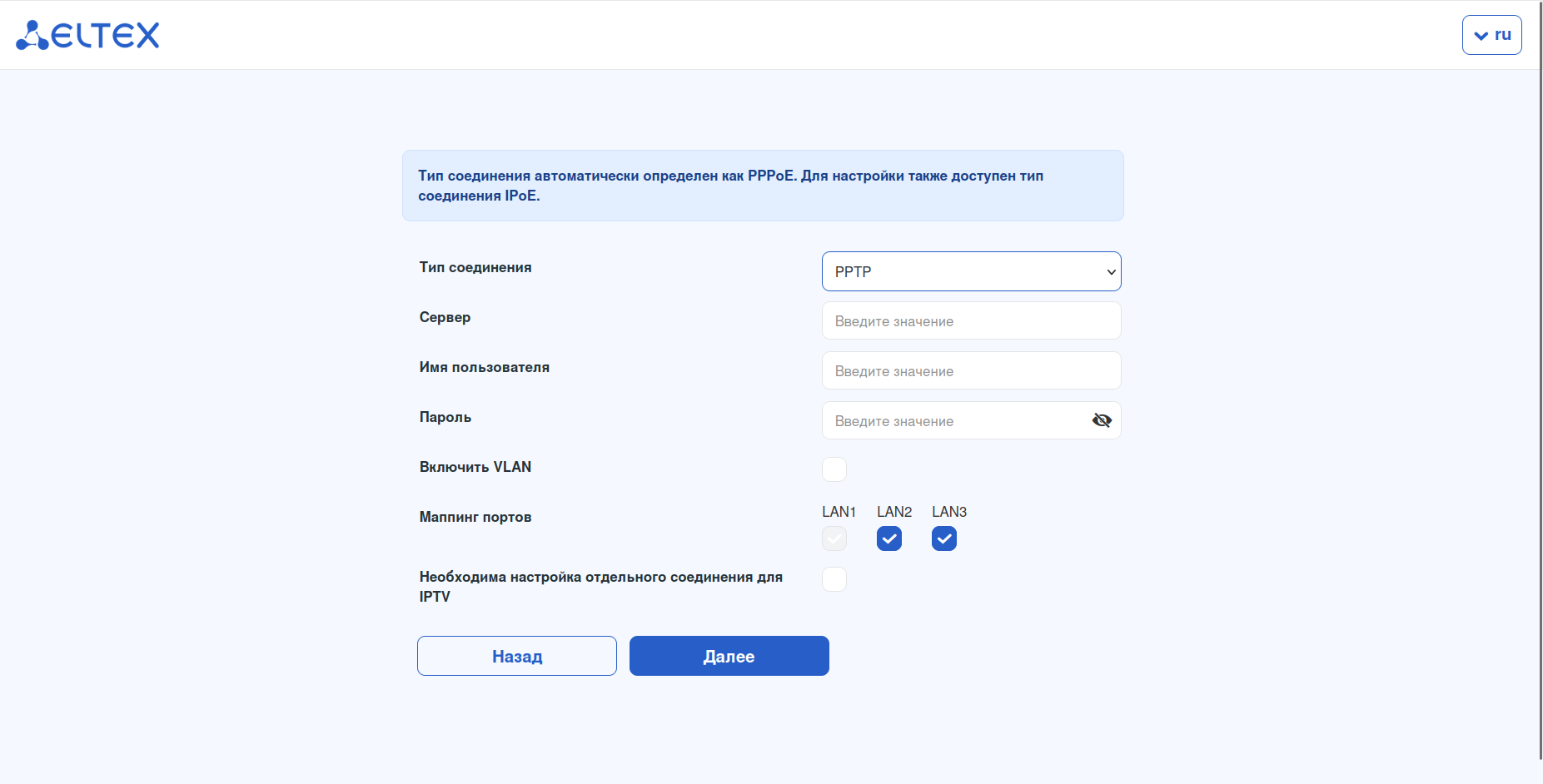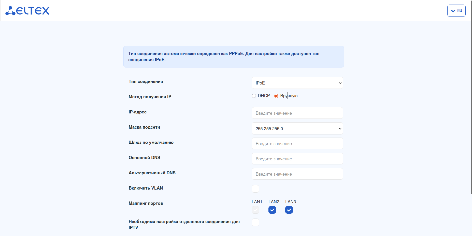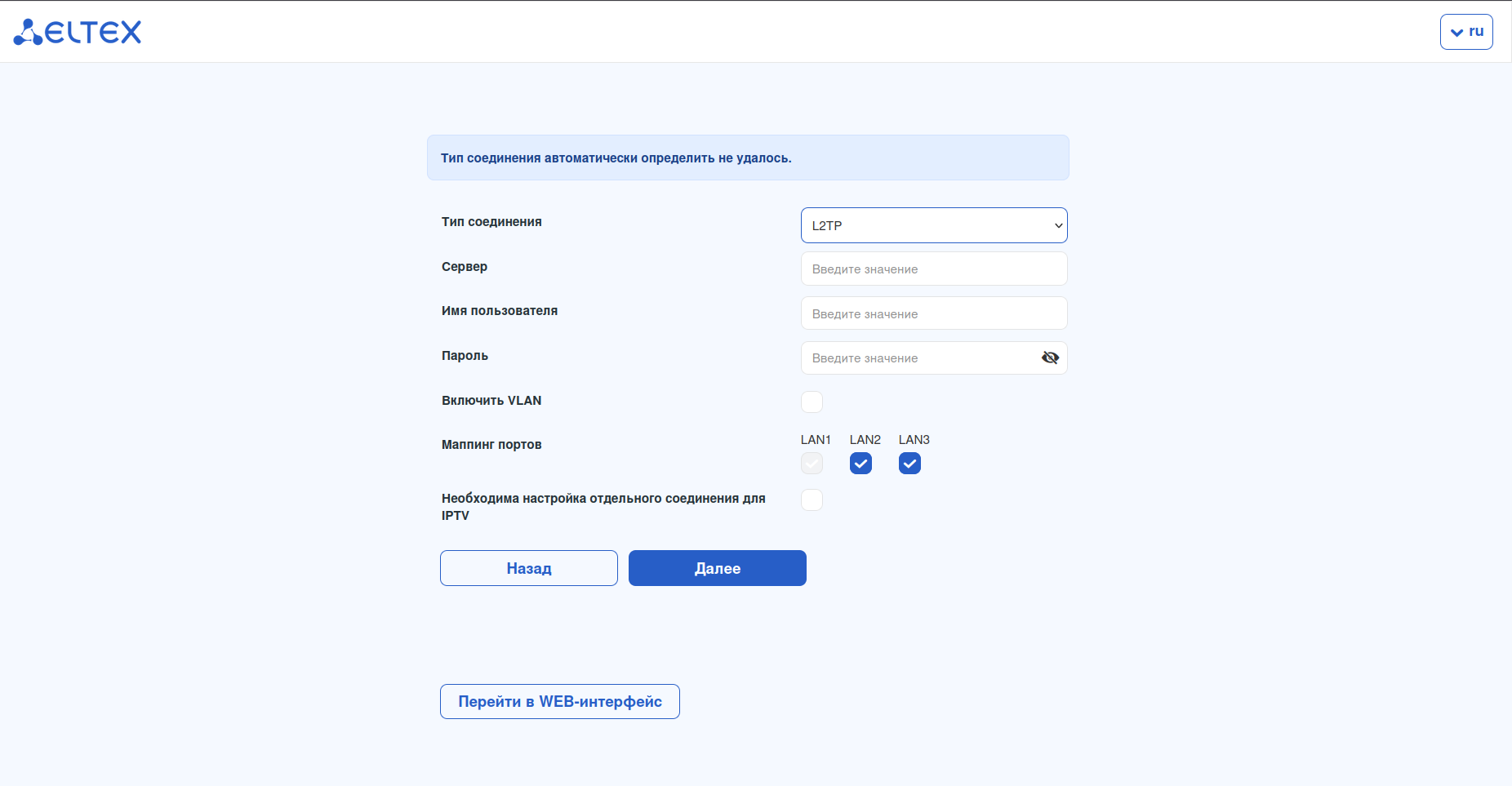 При первом включении маршрутизатора Eltex и подключении сетевого кабеля в WAN-порт требуется указать тип подключения, используемый провайдером.