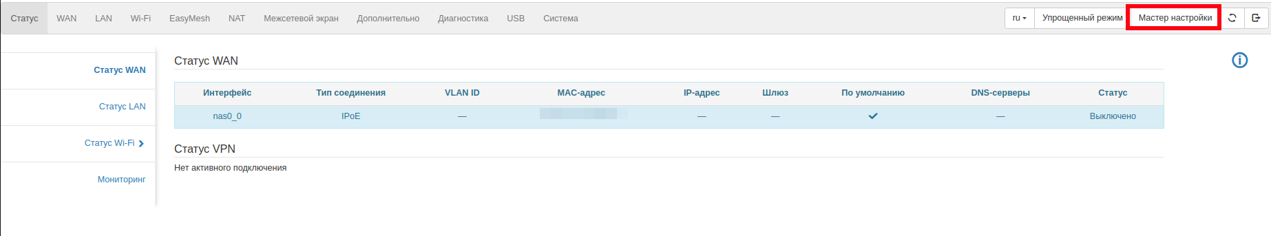 Для запуска мастера настроек на ранее сконфигурированном устройстве необходимо нажать кнопку "Мастер настройки", расположенную в верхнем правом углу экрана.
