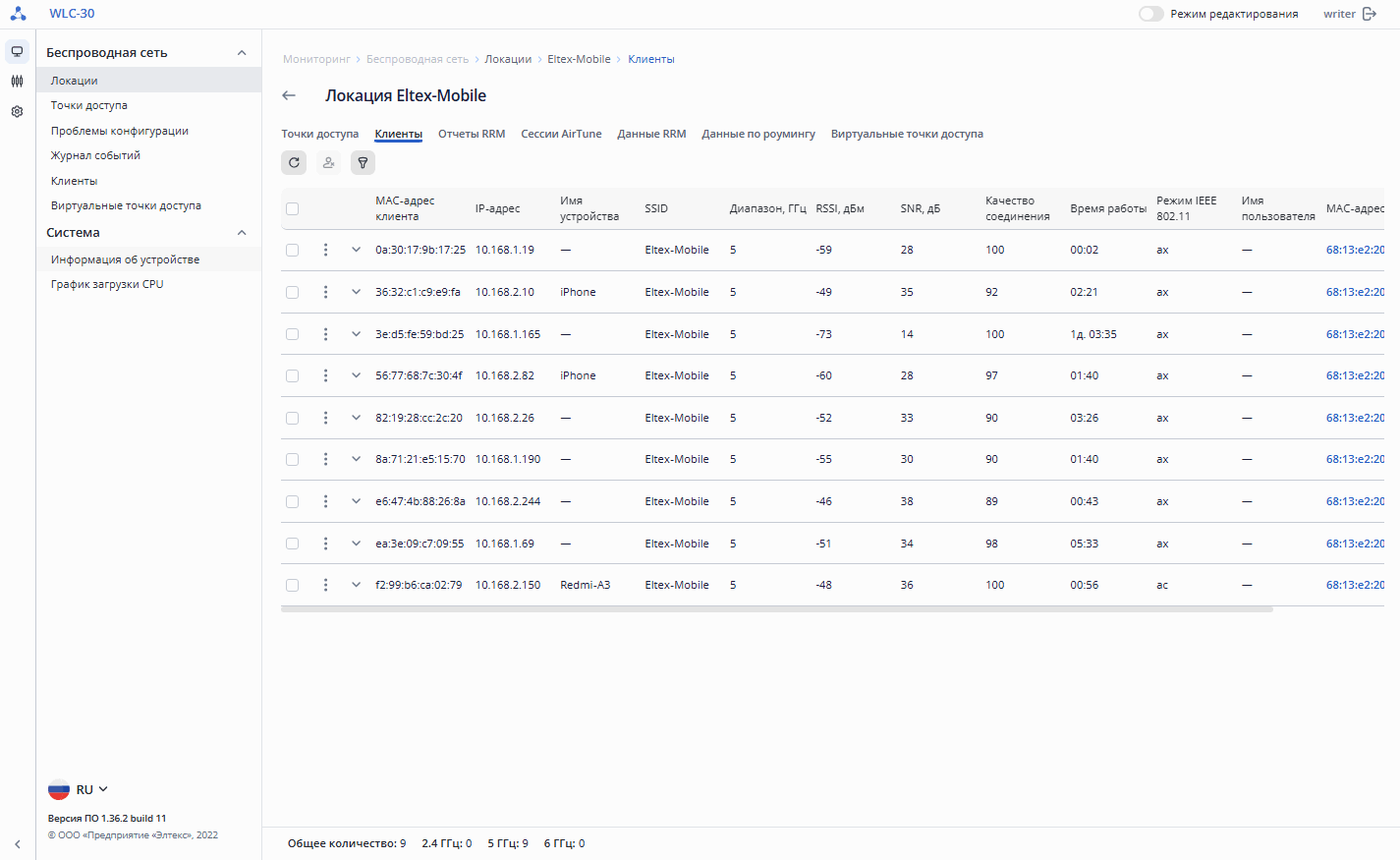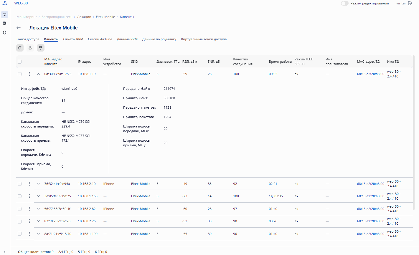 - Количество клиентов в 2.4/5/6 ГГц – число клиентов, подключенных к точке доступа в частотных диапазонах 2.4/5/6 ГГц соответственно;