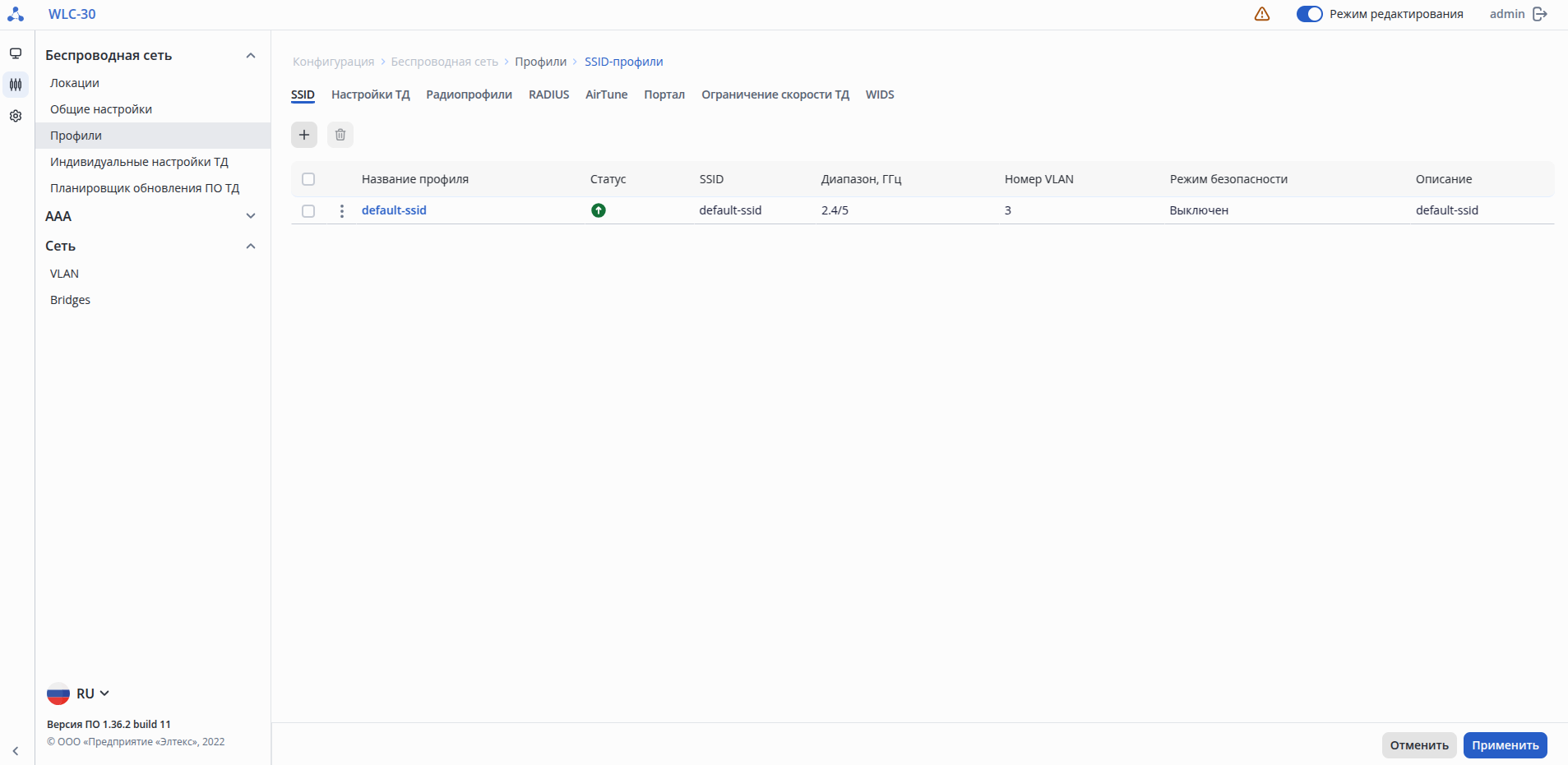 - Состояние Netconf – статус соединения точки доступа и контроллера по протоколу Netconf;