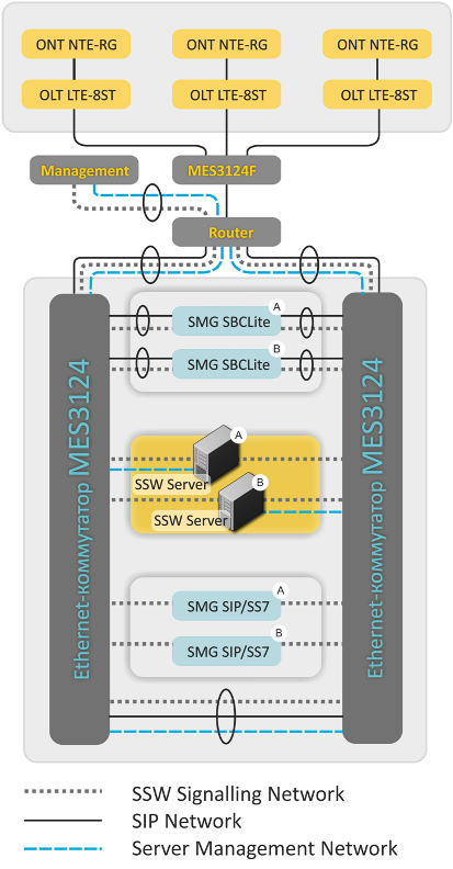 • Гибкий коммутатор SSW — выполняет управление обслуживанием вызовов (функции контроллера медиашлюзов MGC).