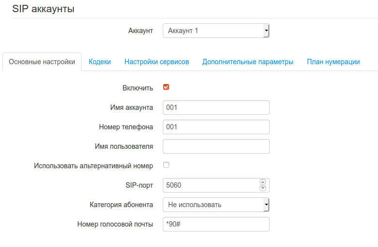 1. Перейти во вкладку IP-телефония — SIP-аккаунты — Аккаунт 1 и ввести требуемые значения в SIP-аккаунты