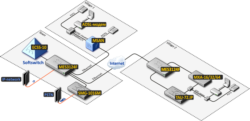 Рисунок 7 — Пример построения сельского узла связи на основе ECSS-10