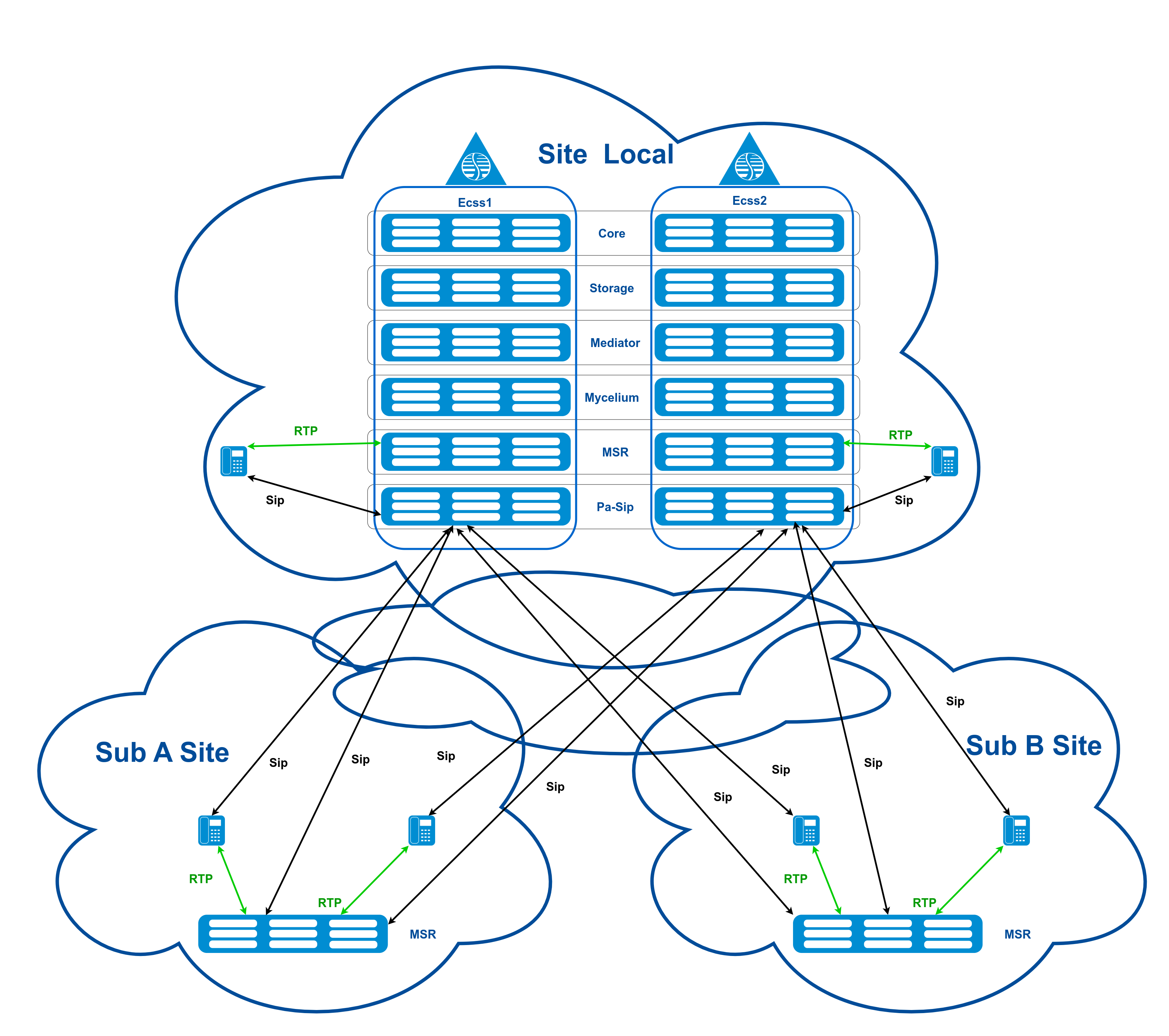 По умолчанию, после установки в ECSS10 существует только один сайт "local". В случае использования нескольких абонентских локаций, с большой локальной речевой нагрузкой, будет хорошим решением приземлять речевой трафик локально, а в центральный офис отправлять только сигнальную информацию. Конечно RTP пакеты для абонентов в центральном офисе будут отправлены на локацию "local". Для реализации данной концепции потребуется не только добавить MSR на локациях "Sub_A_Site", "Sub_B_Site", что мы уже сделали. Но и описать в SSW к каким локациям относится тот или иной абонент. А так же описать правила распределения речевой нагрузки как внутри одной локации, так и между ними.