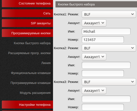 Для настройки клавиш быстрого доступа через функции BLF следует перейти на вкладку программируемые кнопки, кнопки быстрого набора и затем указать для каждой кнопки: