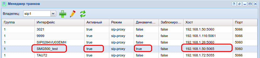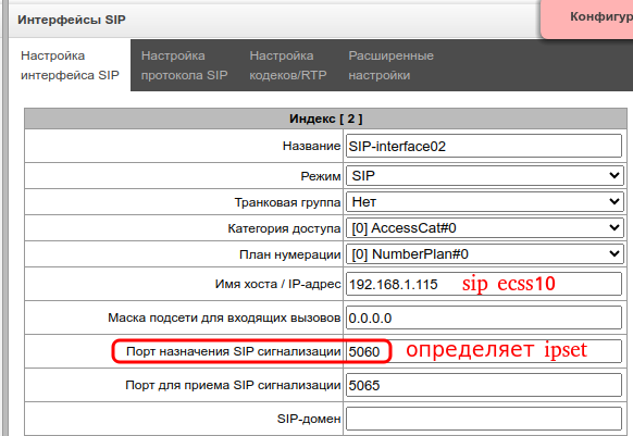 Пример настройки встречного оборудования (SMG500) «Интерфейсы SIP» → «Конфигурация» → «Настройка интерфейса SIP» и «Настройка протокола SIP»:
