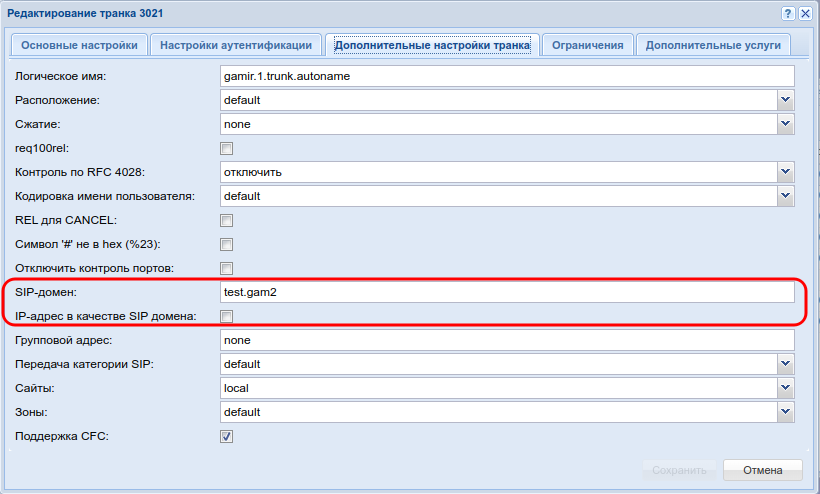 Необходимо обратить внимание на Имя. Имя транка это не только формальное имя для того, чтобы различать транки между друг другом, но и user-name (имя пользователя/номер). То есть с этим именем/номером встречное оборудование должно зарегистрироваться на ECSS10 (как динамический транк).