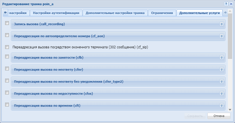 Дополнительное описание параметров интерфейсов (транков) приведено в Приложении Б. Набор параметров интерфейса SIP.