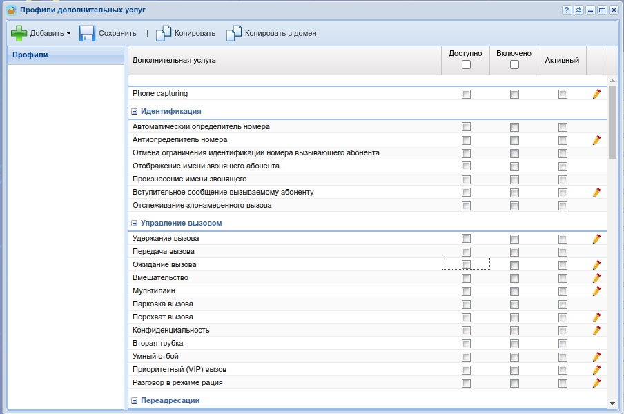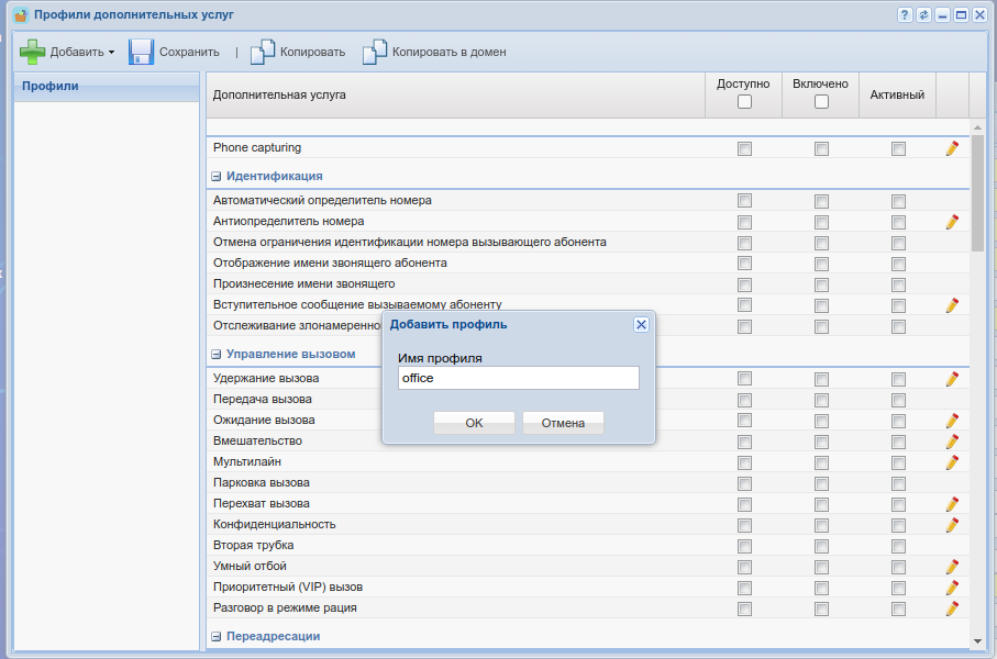3. Выберите услуги, которые требуются для абонентов, работающих с профилем «office». Для этого расставьте галочки на необходимых услугах: