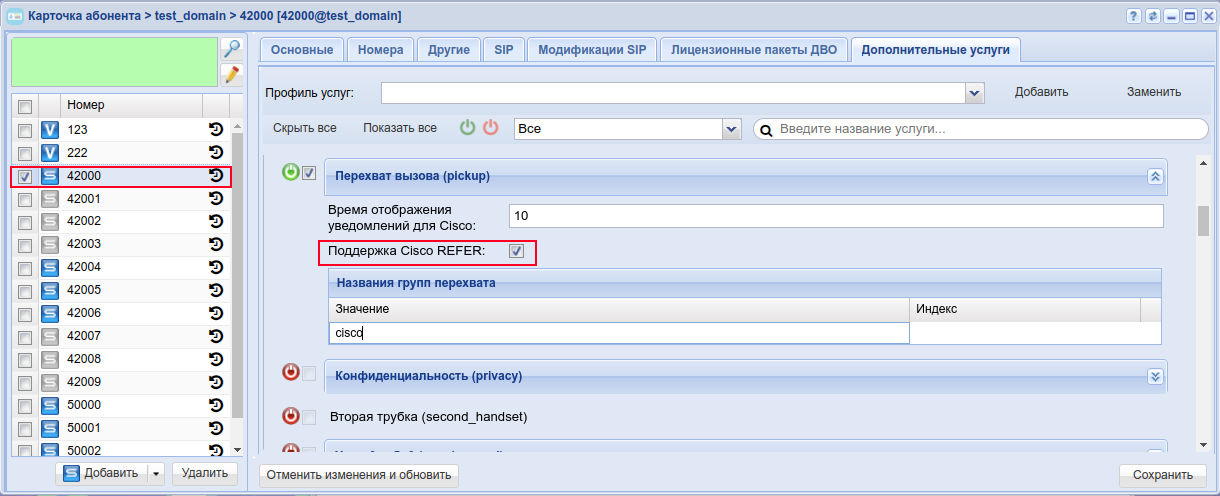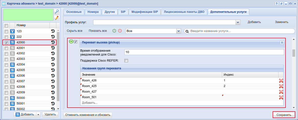- Разрешите использовать услугу абоненту — установите . Установите флаг напротив услуги "Перехват вызова (pickup)".