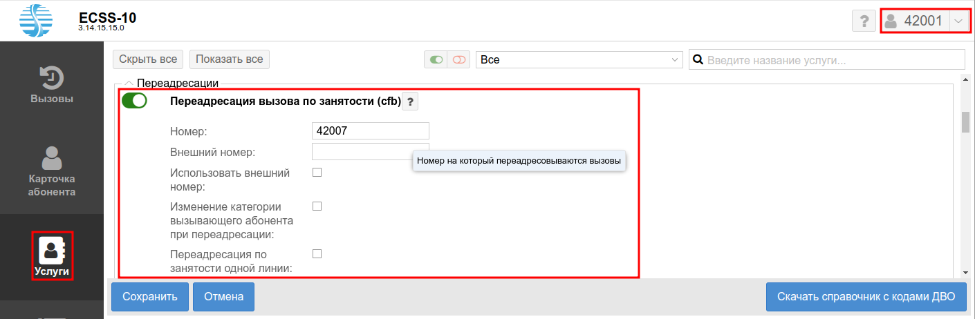 2. Разрешите использовать услугу абоненту — установите . Установите флаг напротив услуги "Переадресация вызова по занятости (cfb)".