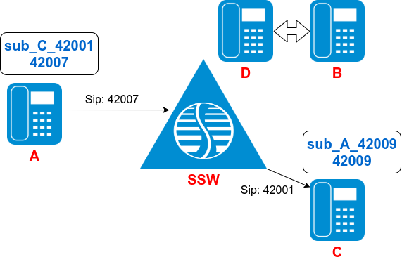 • SSW переадресует вызов на абонента С(42001).