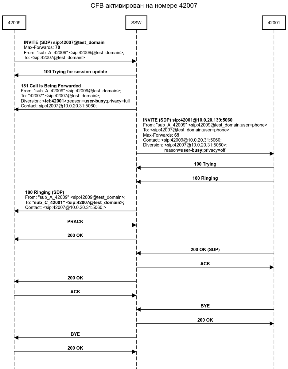 • Абонент B(42007) активизировал услугу CFB. Переадресация вызова по занятости активизирована на заранее определенный номер абонента C(42001).