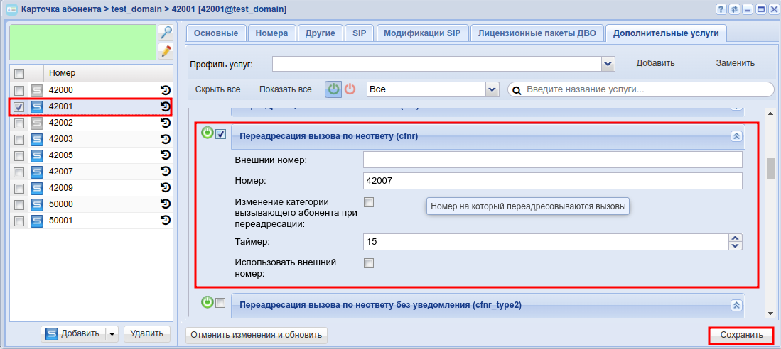 Разрешите использовать услугу абоненту — установите . Установите флаг напротив услуги "Переадресация вызова по неответу (cfnr)" ("Call Forwarding No Reply") Type2".