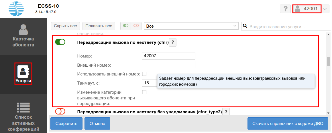 Разрешите использовать услугу абоненту — установите . Установите флаг напротив услуги "Переадресация вызова по неответу (cfnr)".