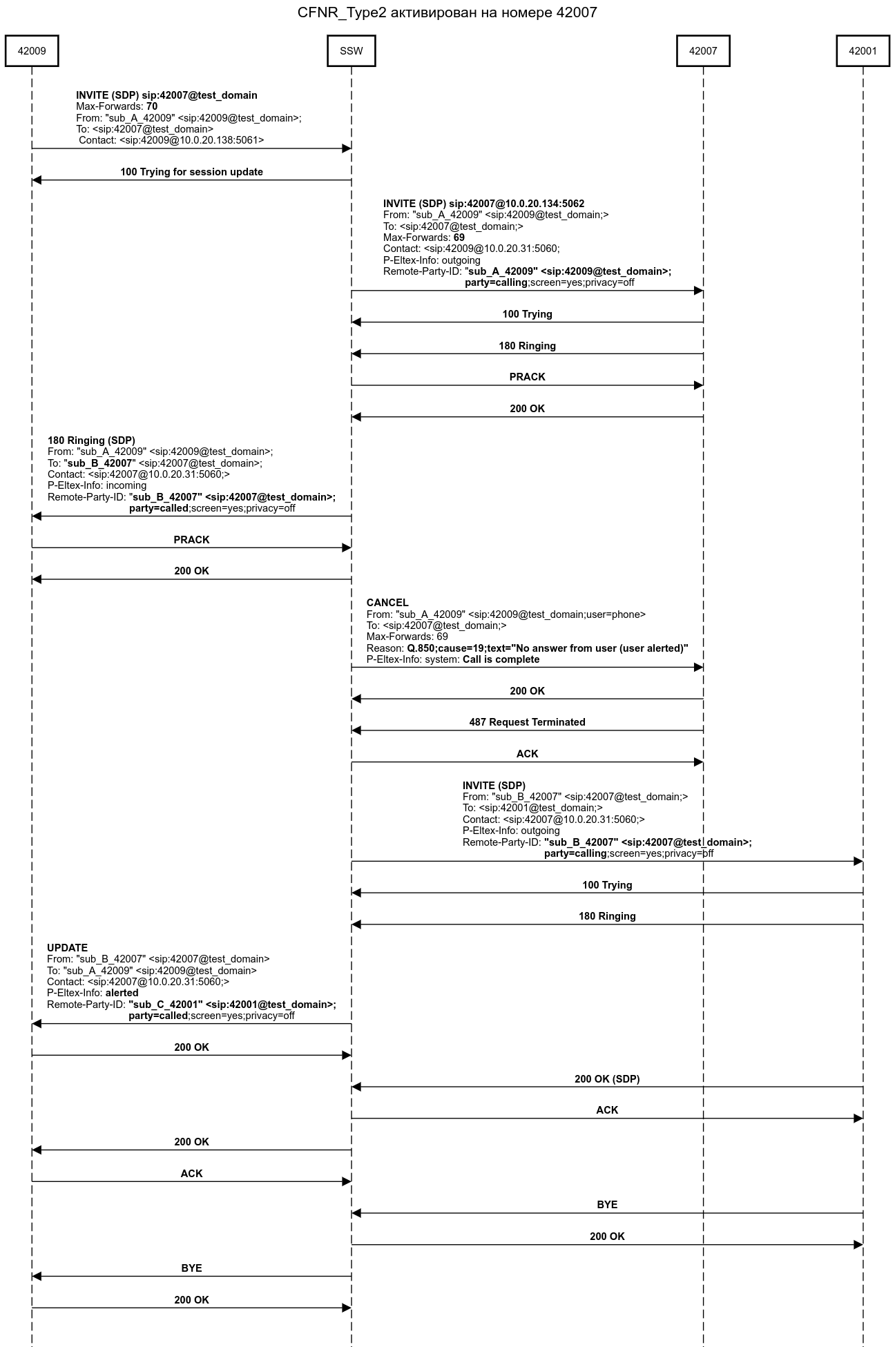 Абонент B(42007) активировал услугу CFNR_Type2. Переадресация вызова по неответу Тип2 активирована на заранее определенный номер абонента C(42001).
