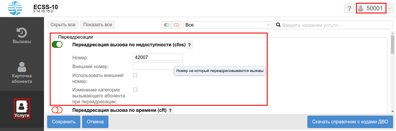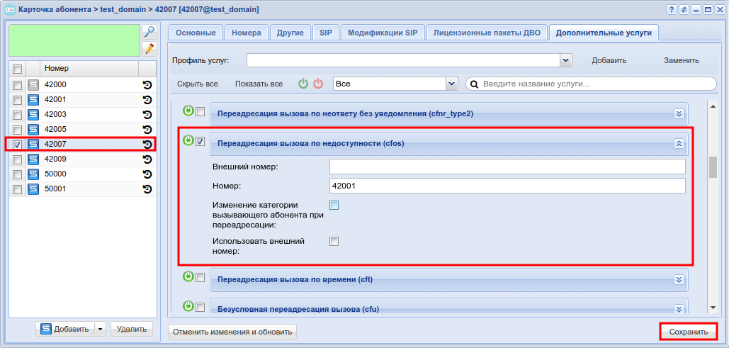 - Разрешите использовать услугу абоненту — установите . Установите флаг напротив услуги "Переадресация вызова по недоступности (cfos)".