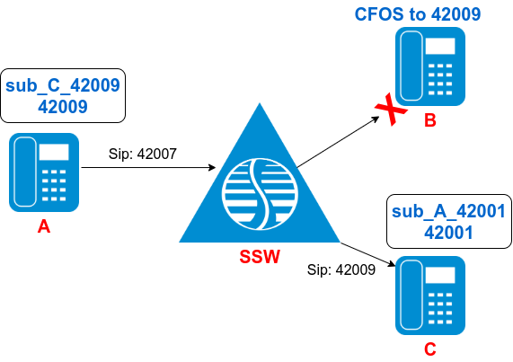 - SSW переадресует вызов на абонента С(42009).