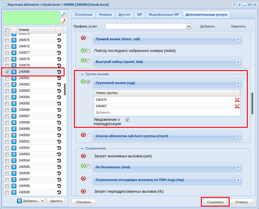 - Разрешите использовать услугу абоненту — установите . Установите флаг напротив услуги "Групповой вызов" ("Group-calling").