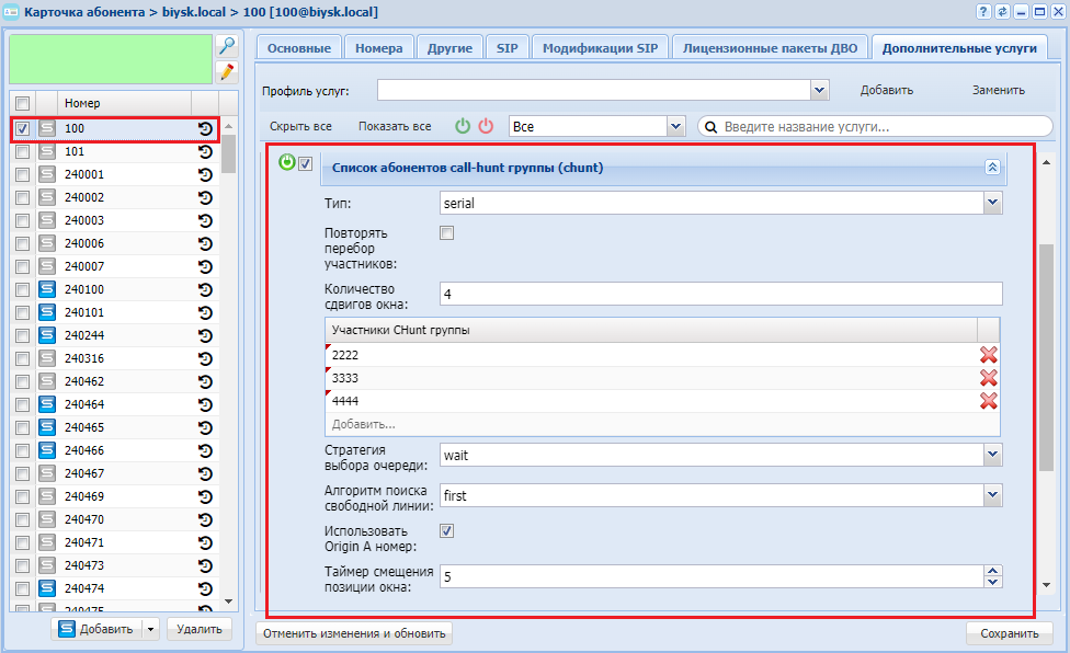Для активации услуги установите флаг напротив значения "Список абонентов call-hunt группы", выберите тип "serial" и выполните настройки: