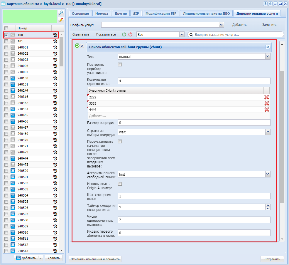 2. Разрешите использовать услугу абоненту — установите . Установите флаг напротив услуги "Список абонентов call-hunt группы" ("Chunt"), выберите тип "manual".