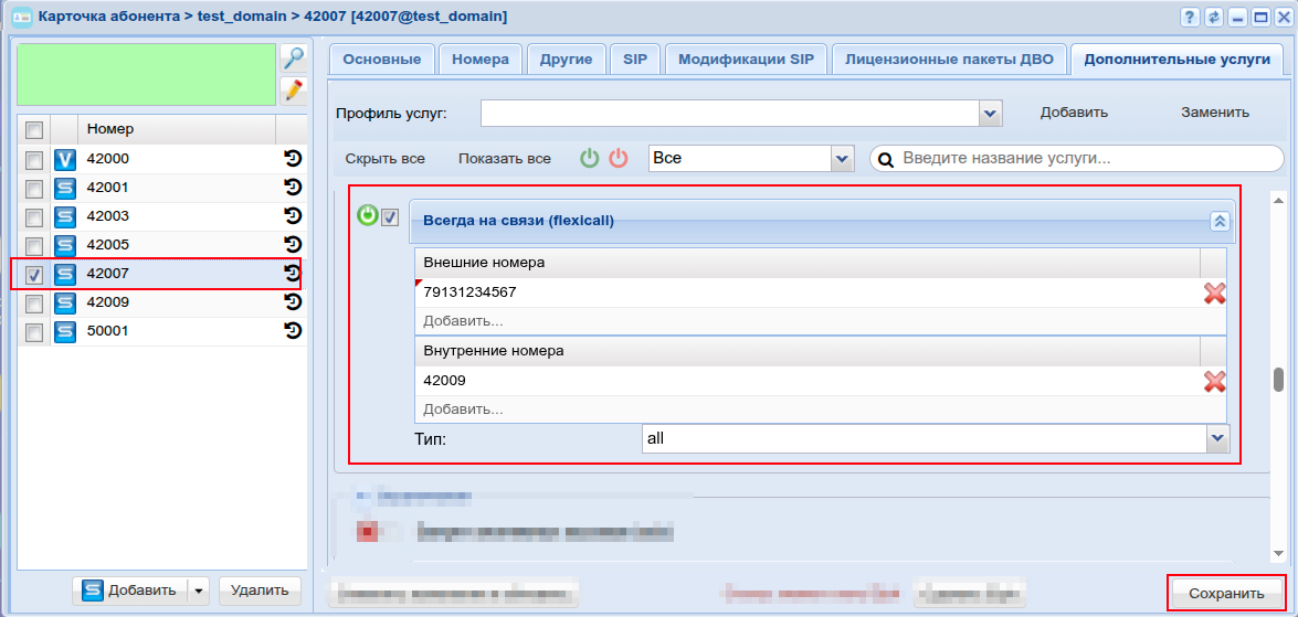 Настройка услуги для всех абонентов определенной виртуальной АТС, а также для определенного абонента в отдельности выполняется в приложении "Subscriber card" ("Карточка абонента").