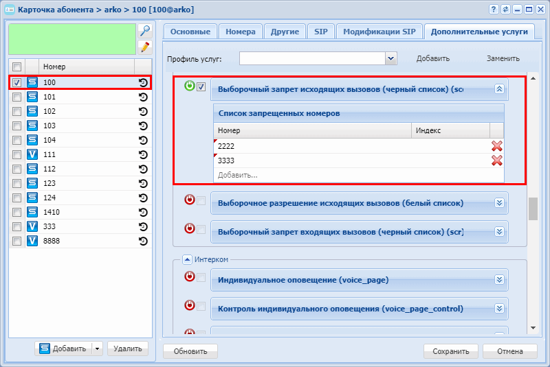 Для активации услуги установите флаг напротив значения "Выборочный запрет исходящих вызовов (черный список) (sco_black)".