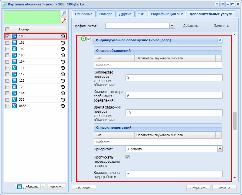 • Для активации услуги установите флаг напротив значения "Индивидуальное оповещение (voice_page)".