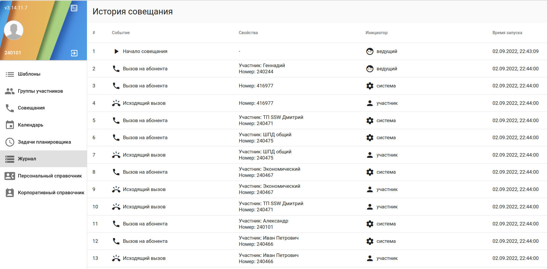 - Номер — номер виртуального абонента, с которого было собрано селекторное совещание;