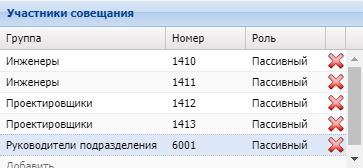 Для добавления внешнего абонента в таблице "Участники совещания" в колонке "Номер" в последней строке укажите номер внешнего абонента — 6001.
