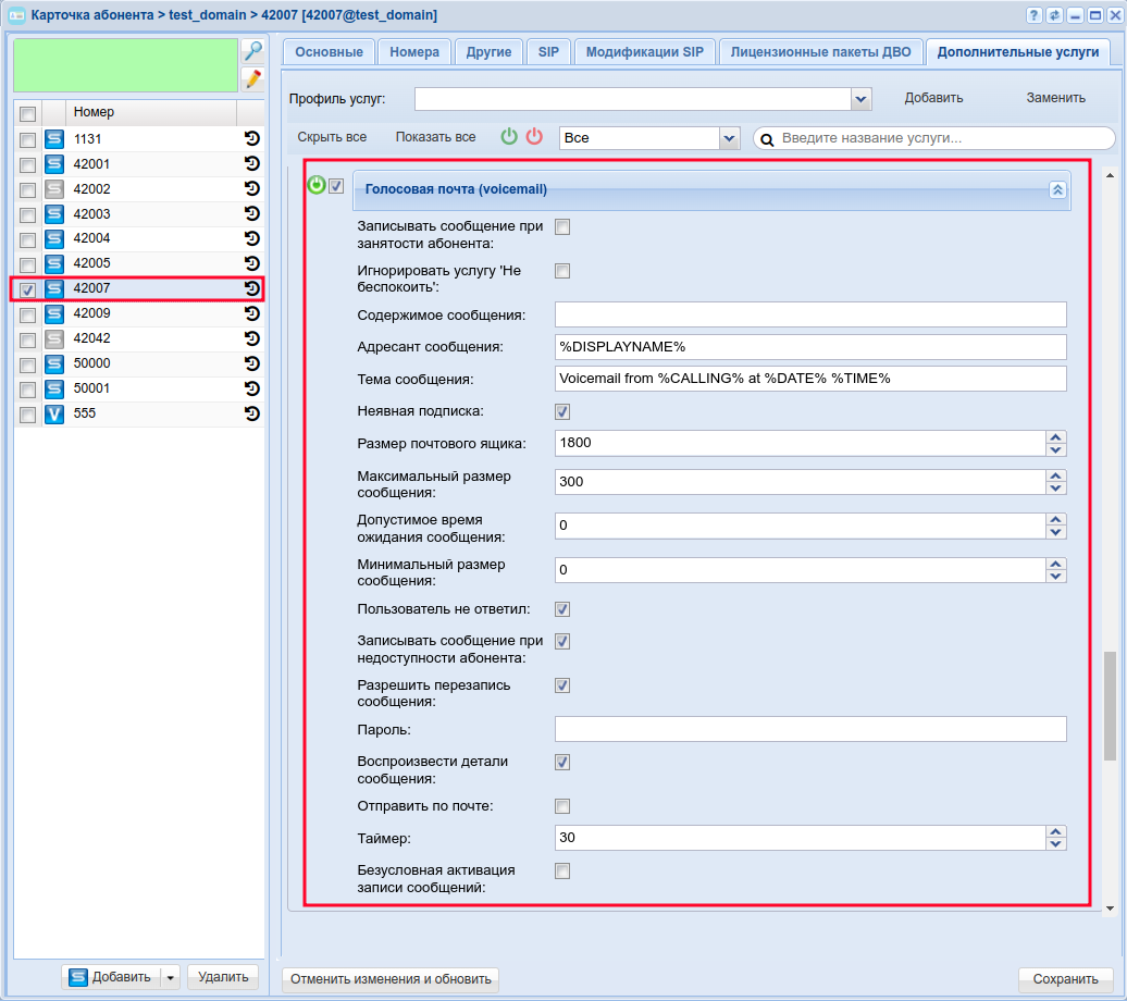 Активировать услугу "Голосовая почта (voicemail)" ("Voice mail service") для абонента с номером 42007 виртуальной АТС "test_domain".