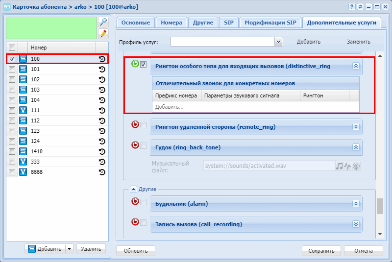 Настройка пользовательской услуги  Distinctive ring осуществляется в стандартном режиме и расширенном режиме web-интерфейса в разделе "Supplementary services" ("Дополнительные услуги") приложения "Subscriber card" ("Карточка абонента").