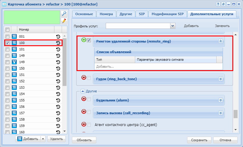 Активировать услугу "Рингтон удаленной стороны (remote_ring)" для абонента с номером 100 виртуальной АТС "refactor".