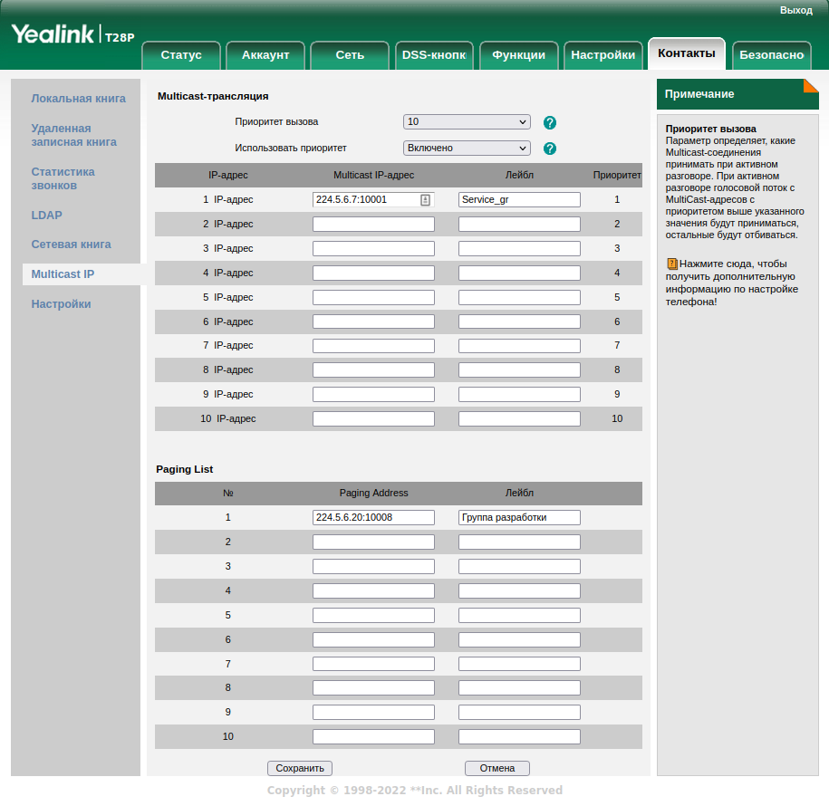 Для настройки Yealink будет использоваться web-интерфейс. Требуется зайти во вкладку "Контакты → Multicast IP". Для прослушивания нужно ввести в поля "Multicast-трансляция" с нужными приоритетами IP и порты, которые требуется прослушивать. Опционально ввести название группы, которая будет отображаться.
