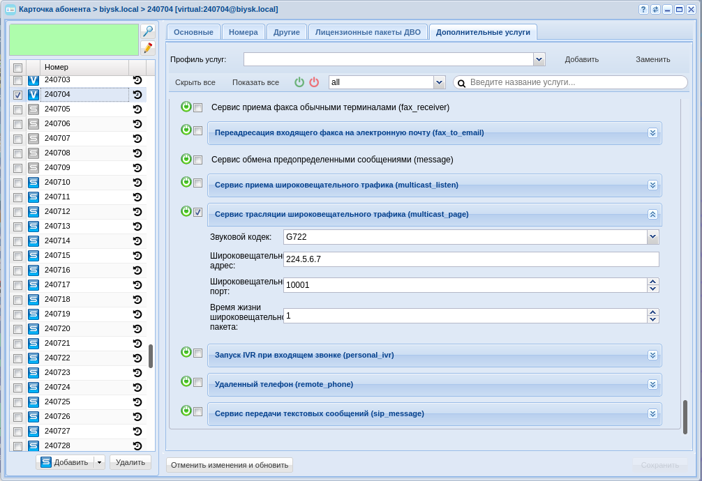 Для этого используем виртуальный номер, например 240704, на котором нужно активировать услугу multicast_page :