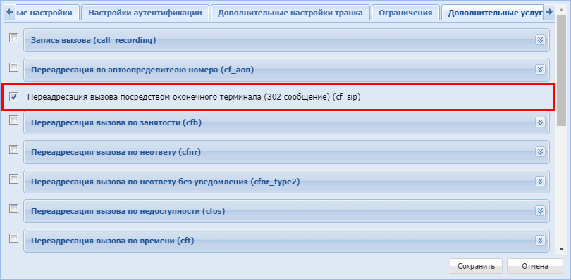Для активации транкового сервиса установите флаг напротив значения "Переадресация вызова посредством оконечного терминала (302 сообщение) (cf_sip).