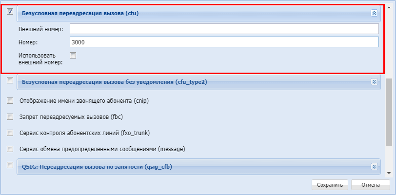 - Разрешите использовать сервис абоненту — установите . Установите флаг напротив сервиса "Безусловная переадресация вызова (cfu)".