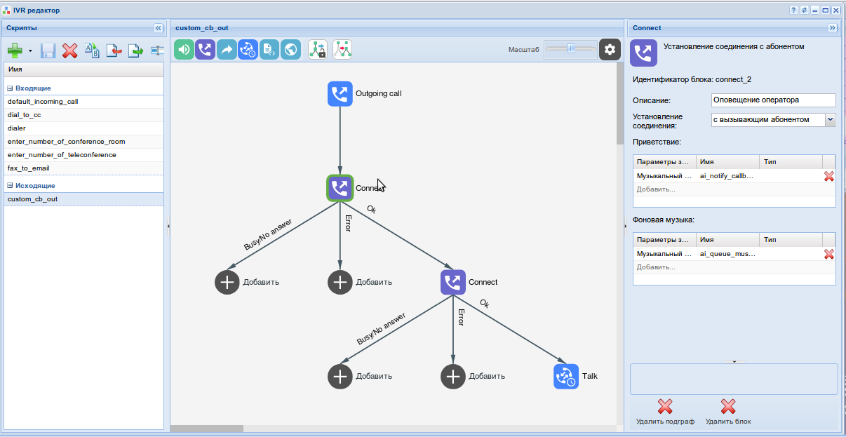 Например:1. вызвать оператора *Клиента*; 2. проиграть информацию о том, что был заказан callback; 3. играть оператору *Клиента* фоновую музыку; 4. сделать вызов на *Абонента*; 5. При ответе *Абонента*: проиграть информацию *Абоненту* о том, что сработал callback; 6. При ответе *Абонента*: проиграть информацию *Абоненту* о том, что он будет соединен с оператором.