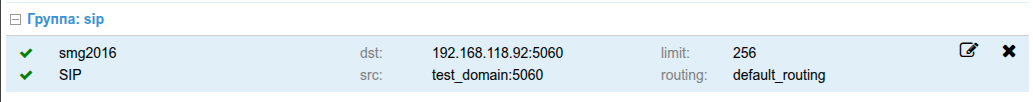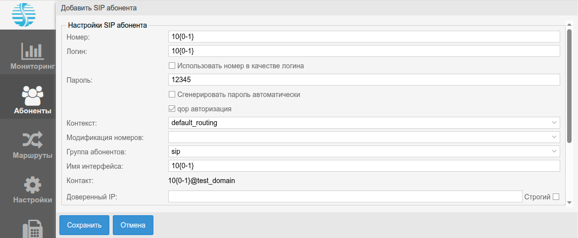 - Имя интерфейса (Interface) — ввести интерфейс(ы) SIP-абонентов в формате: номер@домен_регистрации (10{0-1}@main.domain);