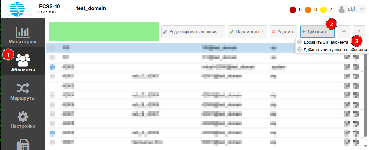 Для добавления SIP-абонентов перейдите в раздел "Абоненты". Нажмите кнопку "Добавить" ("Add"), в контекстном меню выбрать "Добавить SIP абонента" ("Add SIP subscriber").