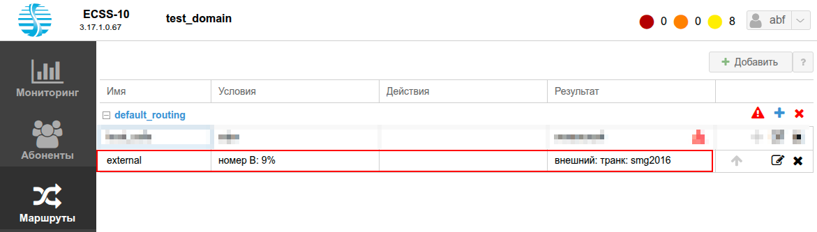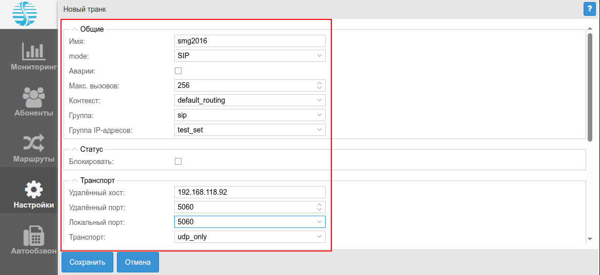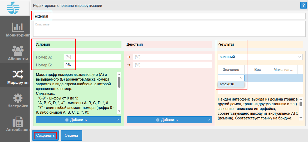 - Результат (Result): Внешний (External), Выбрать значение (Value): smg2016. Подробнее про создание транков можно прочитать в разделе Создание SIP-направления.