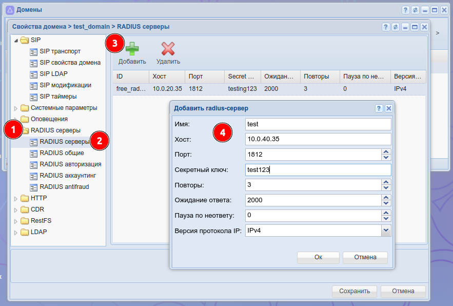 RAIDUS-сервера прописываются к каждой виртуальной АТС отдельно, и затем могут быть использованы в подсистеме авторизации.