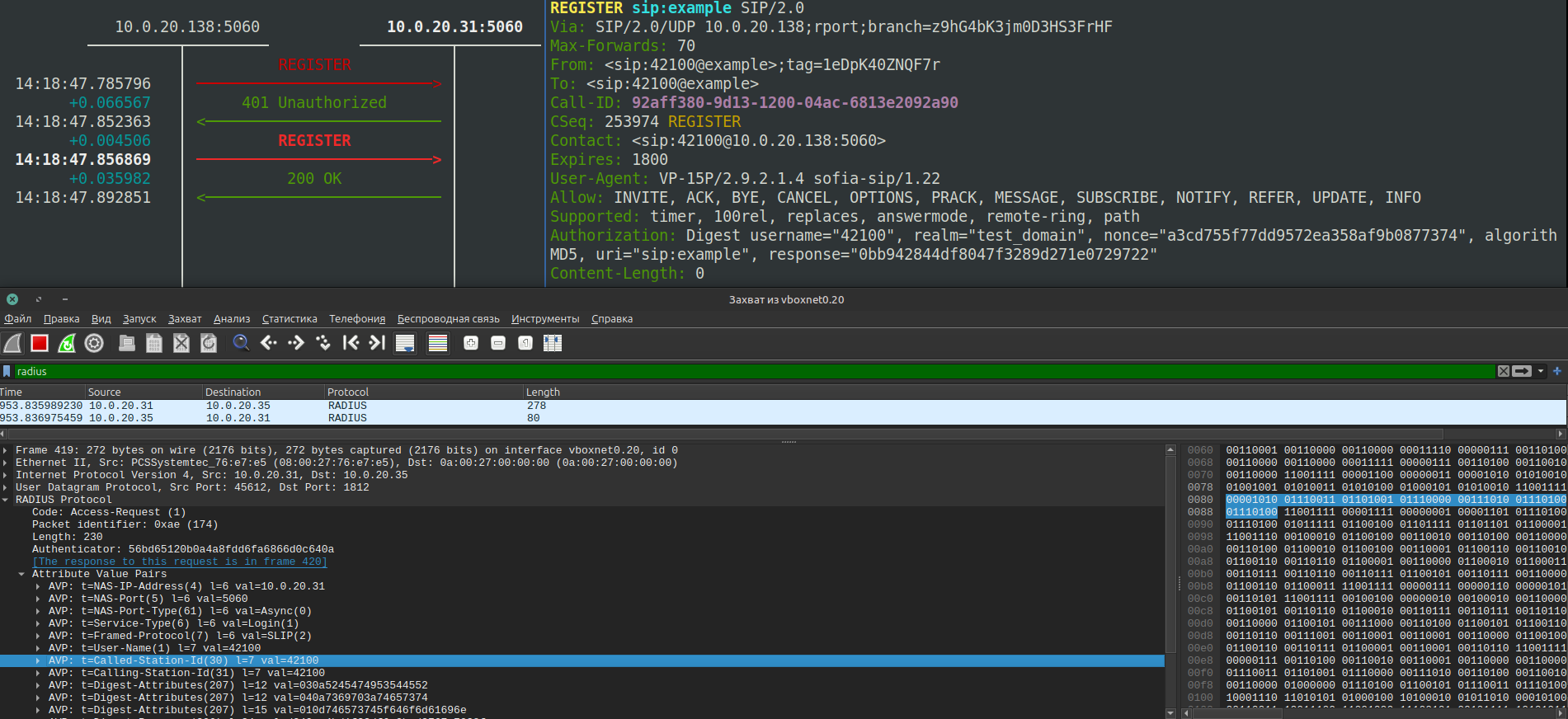 Видим что регистрация прошла успешно, при этом был выполнен запрос на Radius сервер с IP адресом 10.0.20.35