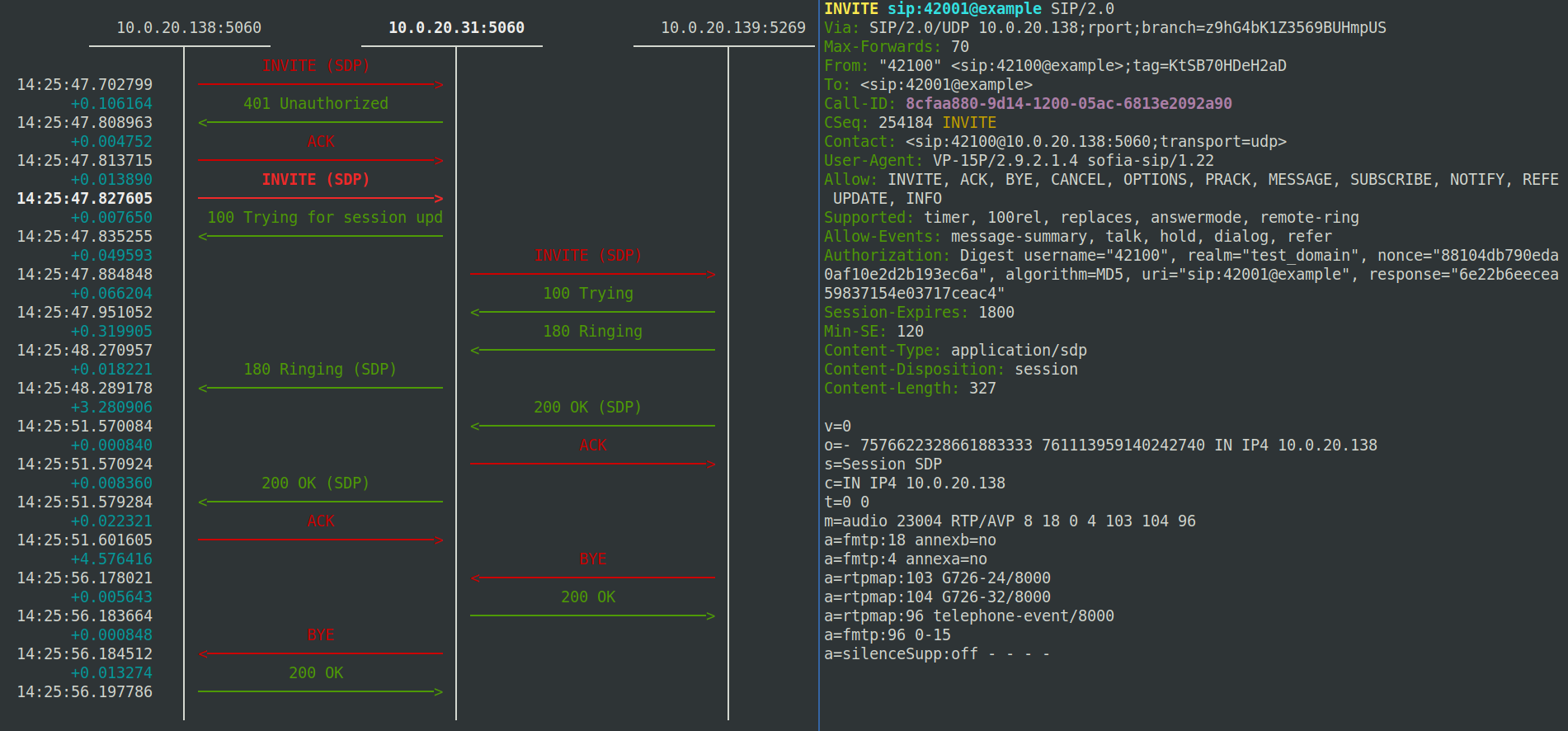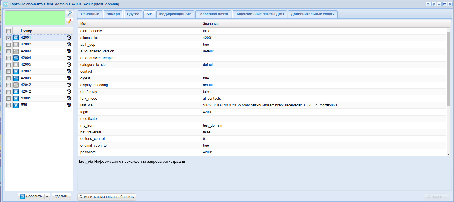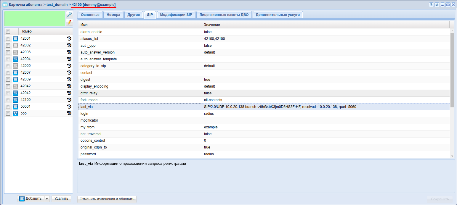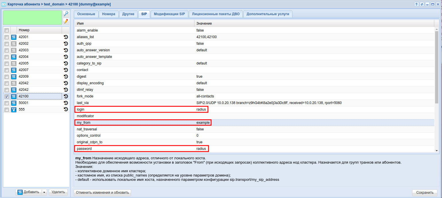 Абонент 42100 делает тестовый звонок sip абоненту 42001 принадлежащему домену test_domain: