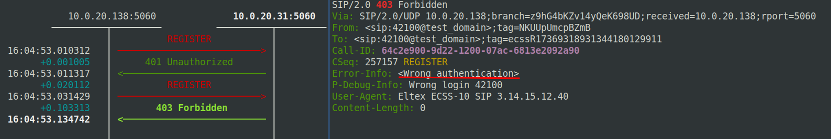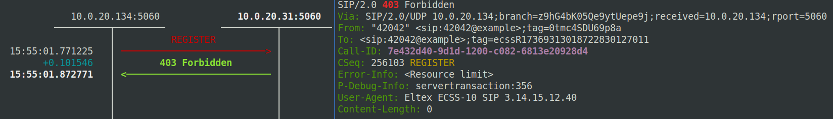 • при создании группы не правильно указано "максимальное количество регистрируемых в данную область sip-пользователей" group-size=1. Один абонент сможет зарегистрировался, а у второго будет ошибка, при этом запрос в сторону RADIUS сервера не будет отправлен. Ограничение размера группы проверяется на SSW: