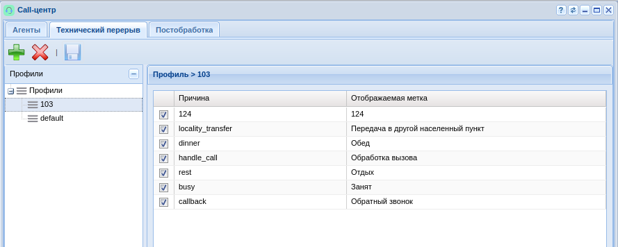 | Технический перерыв если оператор не ответил (auxwork_if_no_answer) | строка | Если установлена какая-либо причина технического перерыва, оператор будет переведен в состояние "Технический перерыв", если не ответит на распределенный на него вызов |